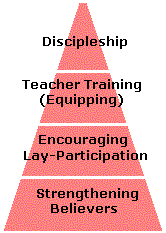 There are five different reasons to co-teach. The first four deal with the desire to impart something of value to the co-teaching partner. These four align with the progressive growth needs of all Christians. Christians must be strengthened in their walk with God, encouraged to serve, equipped with ministry skills, and discipled. The diagram shows the first (strengthening) at the bottom as the others build upwardly upon it. We will cover them in this order.